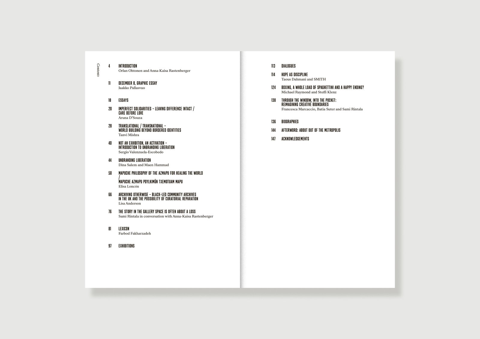 Featuring Lisa Anderson, Aruna D’Souza, Taous Dahmani, Farbod Fakharzadeh, Maen Hammad, Steffi Klenz, Elisa Loncón, Francesca Marcaccio, Tanvi Mishra, Jaakko Pallasvuo, Orlan Ohtonen, Anna-Kaisa Rastenberger, Dina Salem, Sami Rintala, Michael Raymond, Batia Suter, Sergio Valenzuela-Escobedo, SMITH