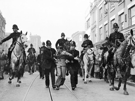 A demonstrator is taken away under arrest by police officers after a mounted baton charge, in East London, on Oct. 4, 1936, to stop fighting between anti-fascists and Sir Oswald Mosley’s blackshirts. (AP Photo/Worth)