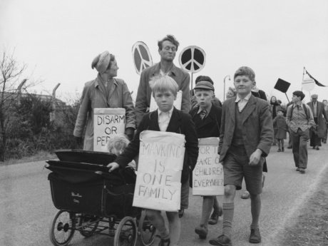 Anti-nuclear protestors march on the road to Aldermaston