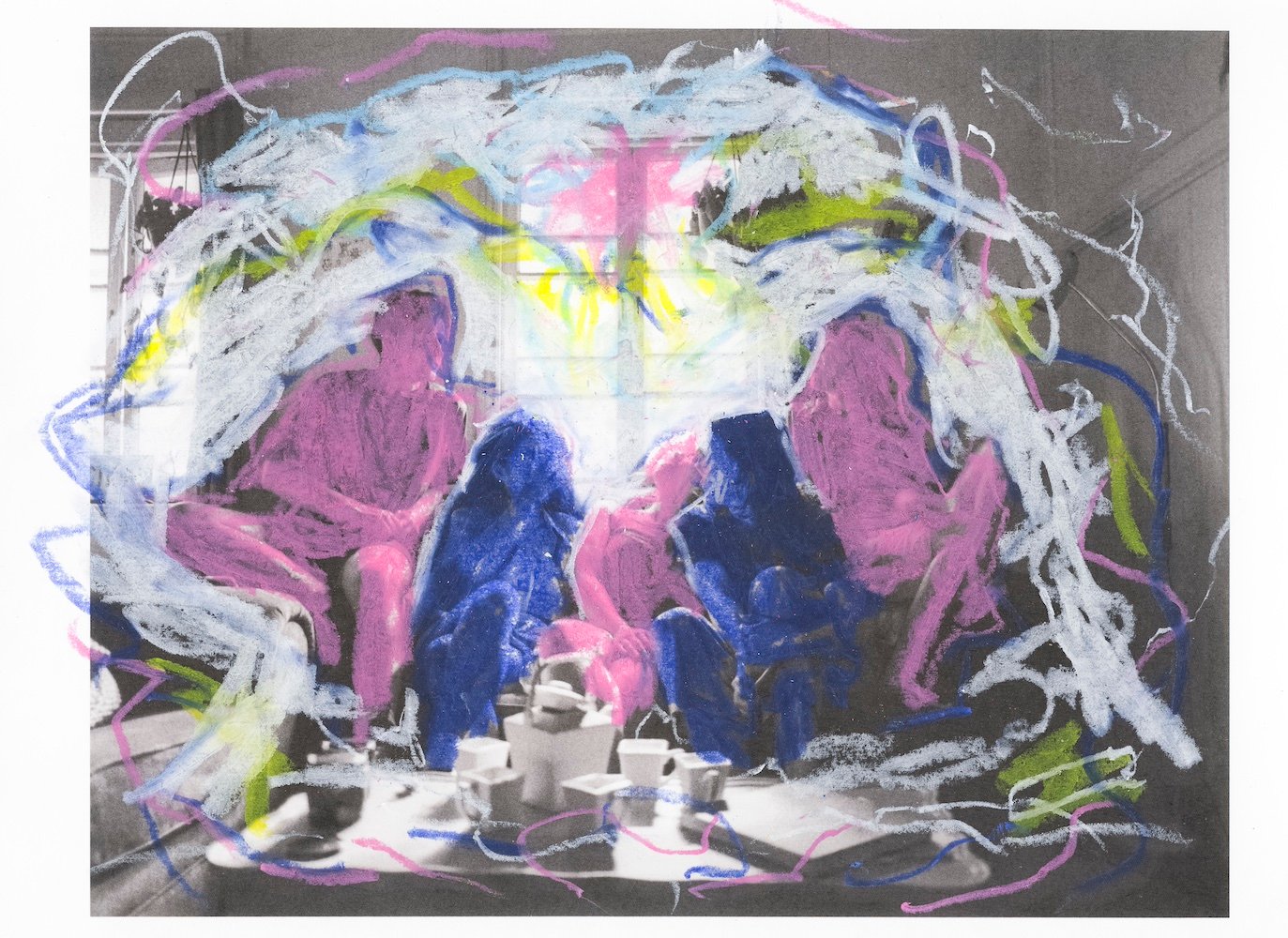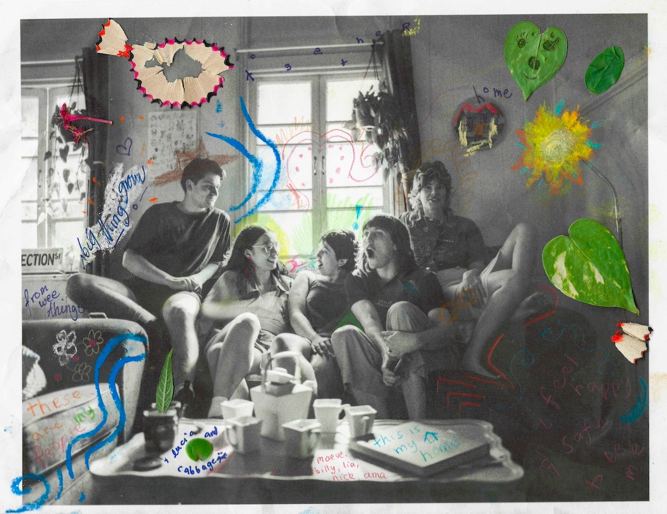 1-Nur Aishah Kenton, (l-r) William Bird, Maeve, Lia Ribeiro de Noronha, Myla Nicholas and Anna Jourdant sit in their Brisbane, Australia share house. Everyone in this shared household identifies as neurodivergent or queer, and finds their place a safe space in which to express themselves. Lia Ribeiro de Noronha writes over the photograph ‘I feel happy and safe to be me’, 2024, from the series Home for a Time © Nur Aishah Kenton, Lia Ribeiro de Noronha