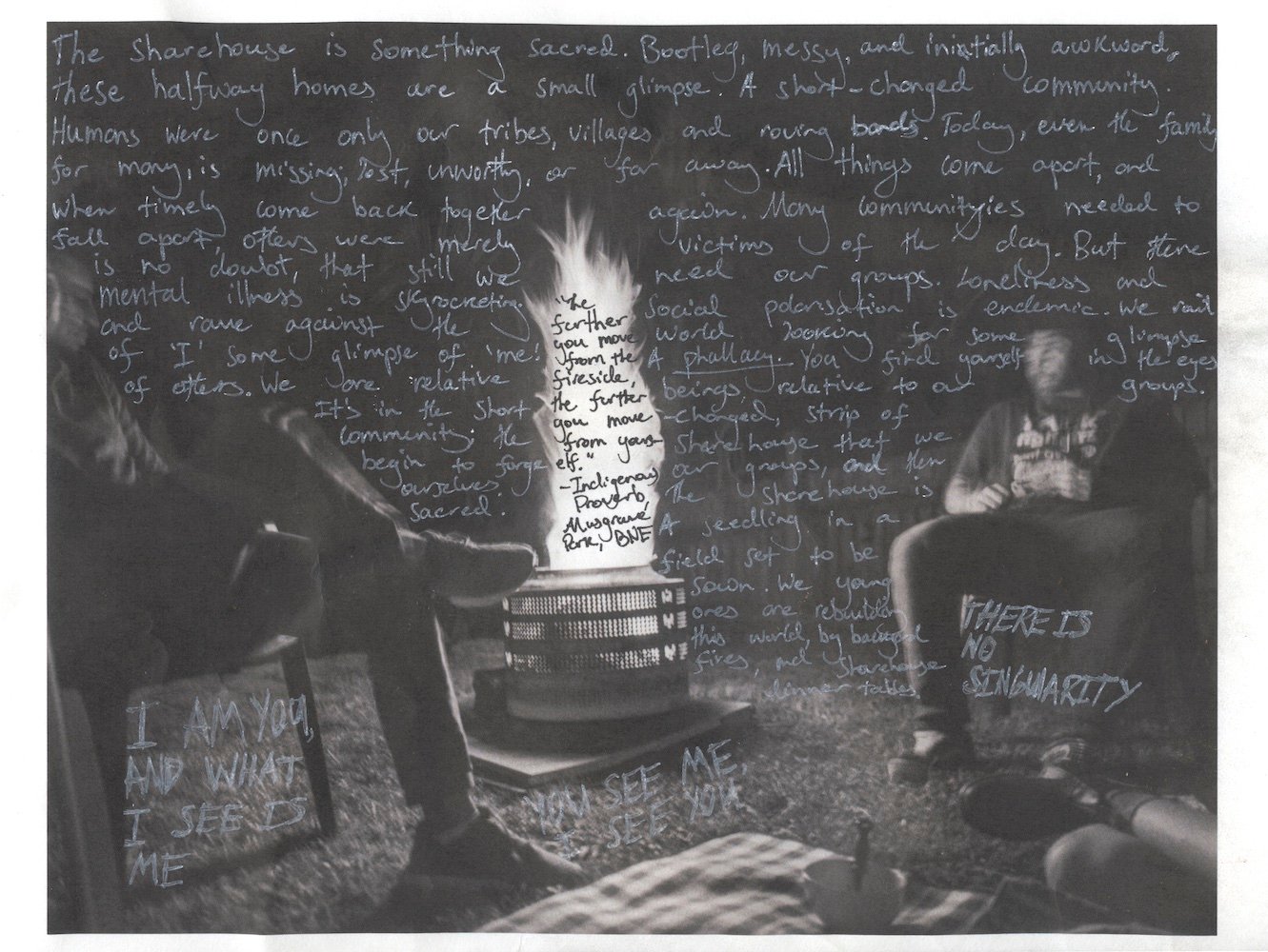 2-Nur Aishah Kenton, Rhett Kleine (r) wrote over this photograph of a communal fire in the backyard of his share house, ‘The share house is a seedling in a field set to be sown’. As a young adult who first leaves home, share housing can be a place where you find yourself as a young adult, as well as your community, 2024, from the series Home for a Time © Nur Aishah Kenton, Rhett Kleine