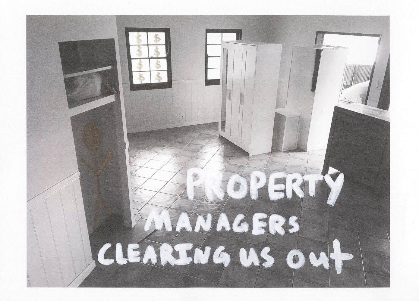 5-Nur Aishah Kenton, During the process of making images for ‘Home for A Time’, some of the participating subjects were forced to vacate and move from their homes. Eviction has become a normalised experience for many young adults, with property owners and landlords free to increase rent amounts without restriction, something housing advocates are fighting to have changed by governments. Participant Sahara Bailey writes over the photograph ‘Property managers clearing us out’, from the series Home for a Time © Nur Aishah Kenton, Bella Porras